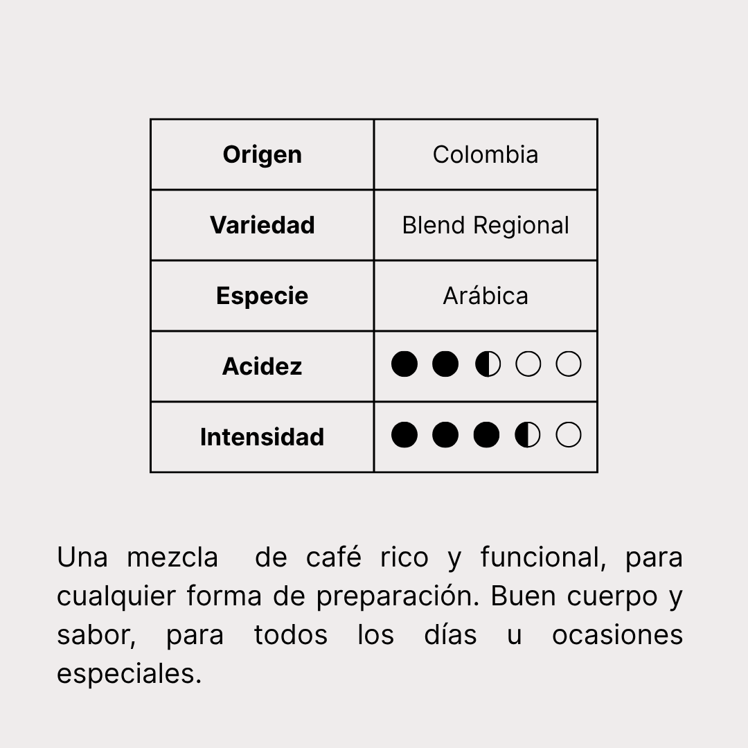 Este blend está pensado como un café cotidiano para paladares cafeteros un poco más desarrollados. Su acidez media e intensidad media alta lo convierten en una muy buena opción para todos los días o para ocasiones especiales.