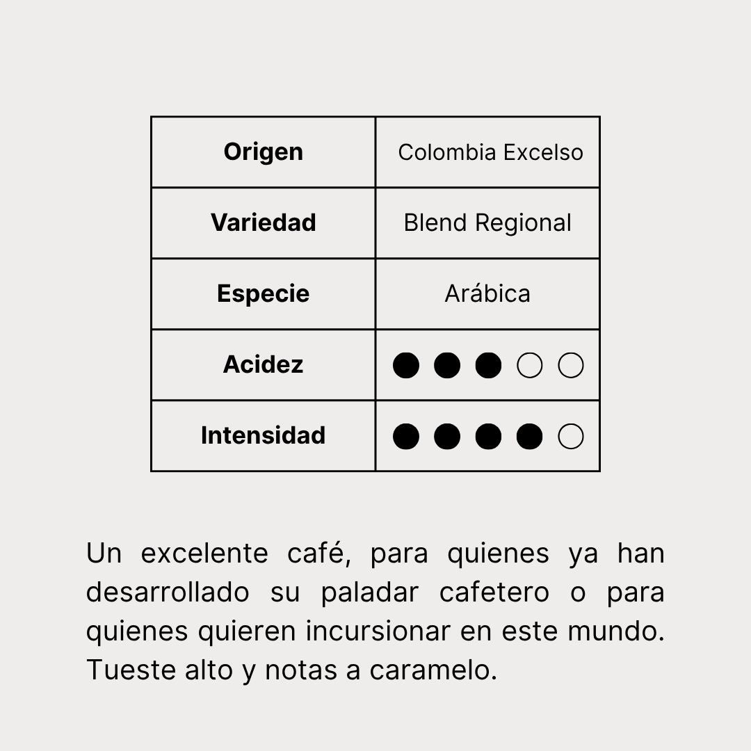 Este exquisito grano está pensado para quienes ya tienen sus gustos definidos en el café o para quienes incursionar en este mundo. De gran cuerpo e intensidad, con notas a chocolate y caramelo.